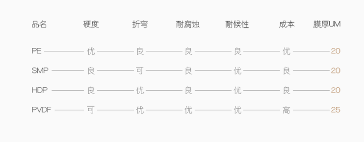 彩色鋼板最常用的面漆種類有:聚酯(PE),硅改性聚酯(SMP),高耐久性聚酯(HDP),聚偏氟乙烯(PVDF),每種面漆適應不同的情況,在經(jīng)濟允許的情況下我們建議使用HDP或者PVDF的產(chǎn)品。