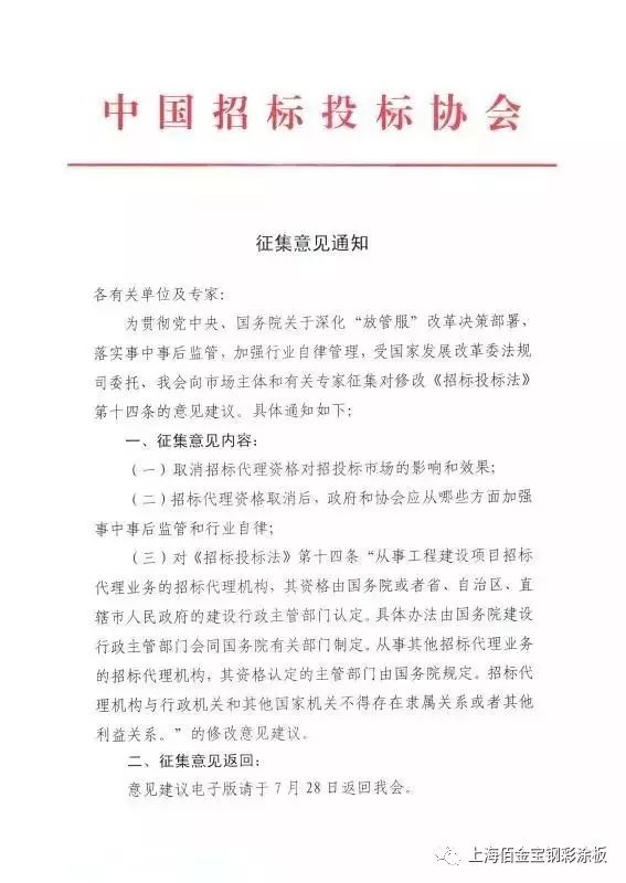 7月31日,受國家發(fā)改委法規(guī)司委托,中國招標(biāo)投標(biāo)協(xié)會(huì)將組織市場(chǎng)主體、業(yè)內(nèi)專家學(xué)者,就《招標(biāo)投標(biāo)法》第十四條關(guān)于工程招標(biāo)代理機(jī)構(gòu)資質(zhì)管理的條款修訂收集意見。