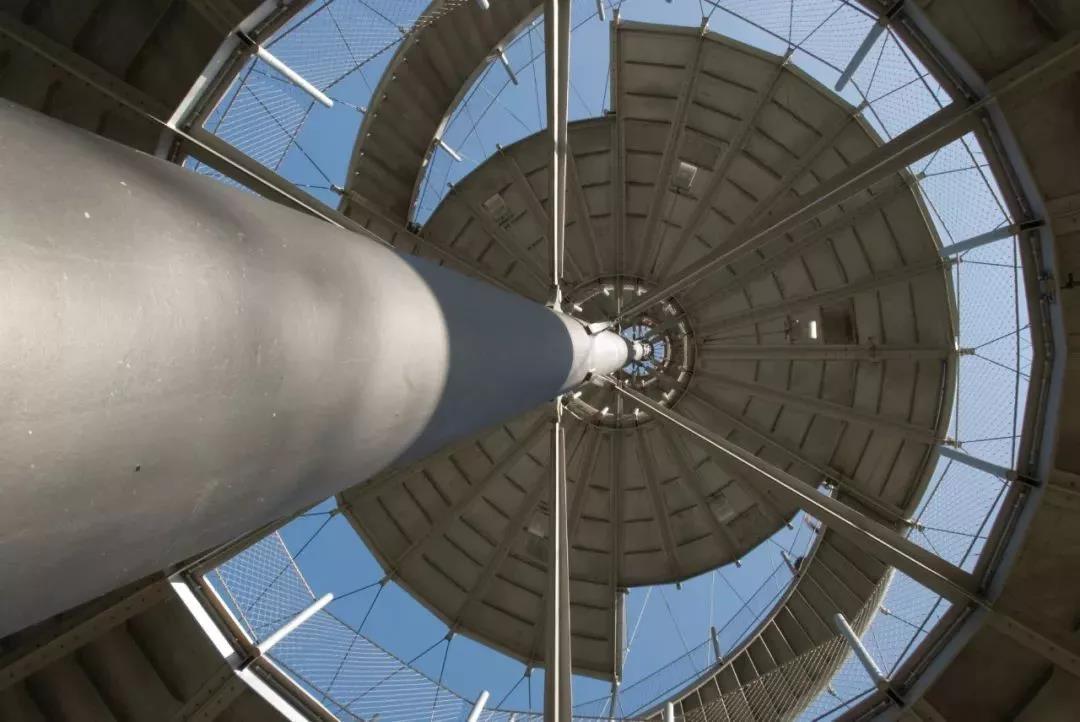 兩條反向螺旋樓梯像極了飄逸的絲帶,從不同的位置開始上升環繞,在15.3m高的屋頂平臺連成一體。