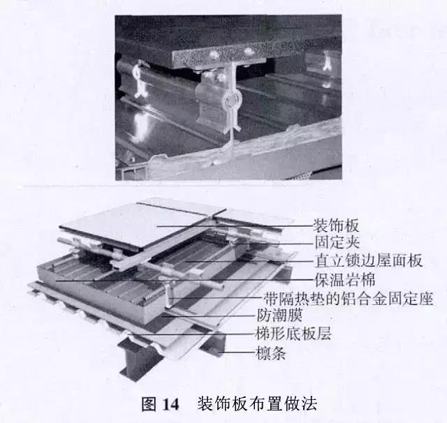 裝飾板系統(tǒng)的連接固定,無需在鋁鎂錳合金板上開洞;兩層板之間的開放式連接,無需維護(hù),并可降低清理要求;可調(diào)節(jié)系統(tǒng)使裝飾板可完美布置,裝飾板布置做法見圖14。