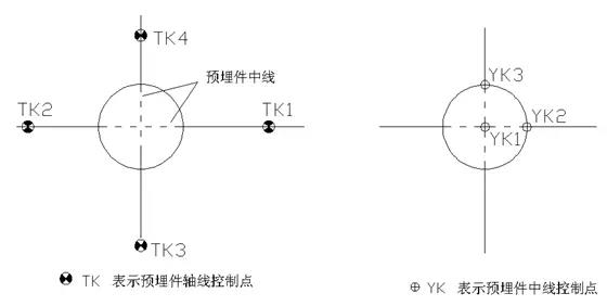 在設計圖紙上根據各預埋件的結構中線確定YK1、YK2、YK3的位置,獲得其坐標值,在預埋件上做出YK1、YK2、YK3的標志。用全站儀極坐標法線定位YK1點,確定預埋件的中點位置,再用同樣的方法測定YK2、YK3的位置,控制預埋件的軸線方向。